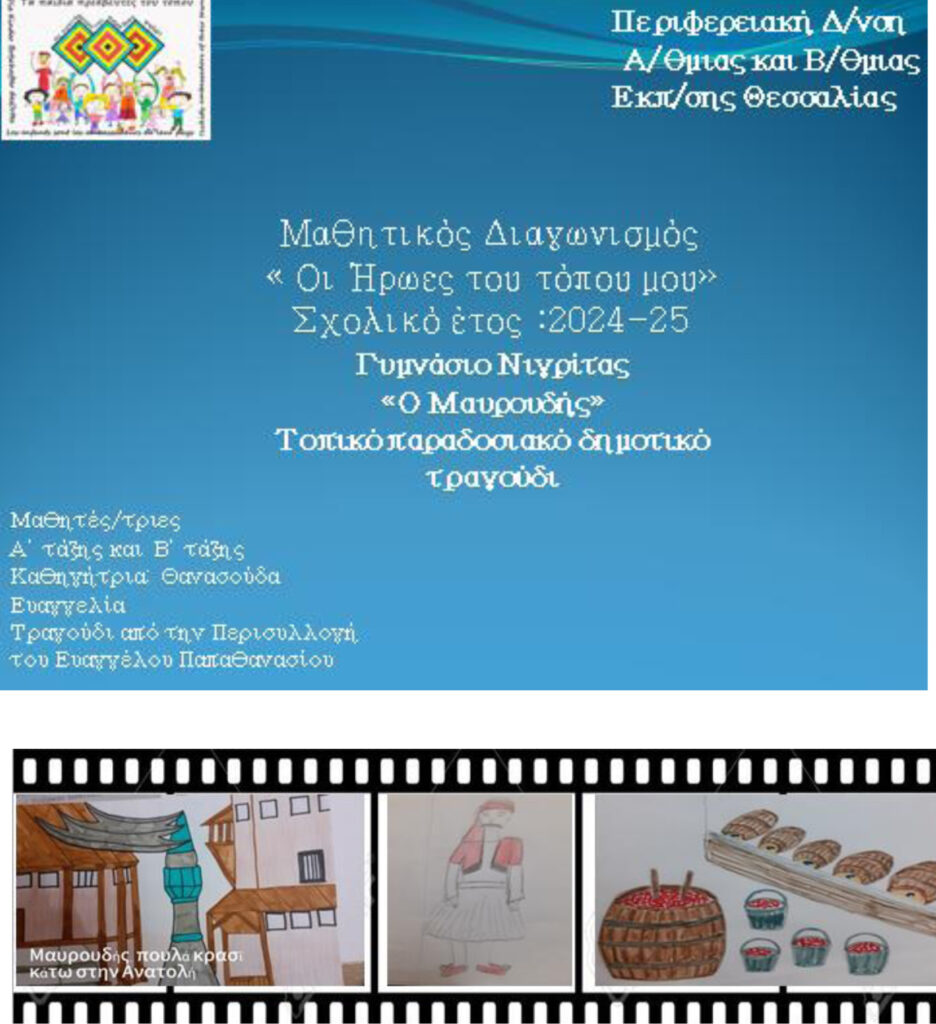 Στο πλαίσιο του Διεθνούς Θεματικού Δικτύου της Πρωτοβάθμιας Εκπαίδευσης Λάρισας«Οι μαθητές πρεσβευτές του τόπου τους.» διοργανώθηκε και ο μαθητικός διαγωνισμός«Οι Ήρωες του Τόπου μου» στον οποίο δήλωσε συμμετοχή και το Γυμνάσιο Νιγρίτας μεομάδα μαθητών από την Α΄και Β΄ τάξη με εμψυχώτρια τη φιλόλογο καθηγήτρια Ευαγγελία Θανασούδα. Το πρωτότυπο έργο των μαθητών αποτελούνταν από πολυσχιδή επίπεδαδημιουργικής εργασίας , έρευνα στα τοπικά δημοτικά τραγούδια της Βισαλτίας, εικαστικές δημιουργίες με αφόρμηση το δημοτικό τραγούδι « Ο Μαυρουδής» και ψηφιακή αποτύπωση των αποτελεσμάτων της έρευνας με τη δημιουργία ενός video πλαισιωμένο με το αρχείο ήχου της Χορωδίας των Τερπνιωτών Θεσσαλονίκη