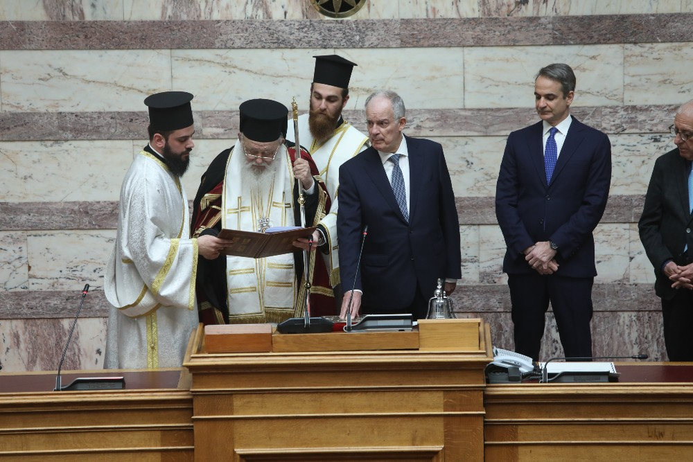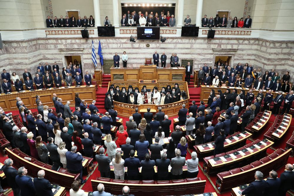 Ακολούθως, κλήθηκε ο β’ αντιπρόεδρος της Βουλής, Γ. Γεωργαντάς να συνοδεύσει στην αίθουσα του κοινοβουλίου τον Μακαριότατο Αρχιεπίσκοπο Αθηνών και πάσης Ελλάδος κ. Ιερώνυμο και τα συνοδεύοντα αυτόν μέλη της Ιεράς Συνόδου της Εκκλησίας της Ελλάδος.