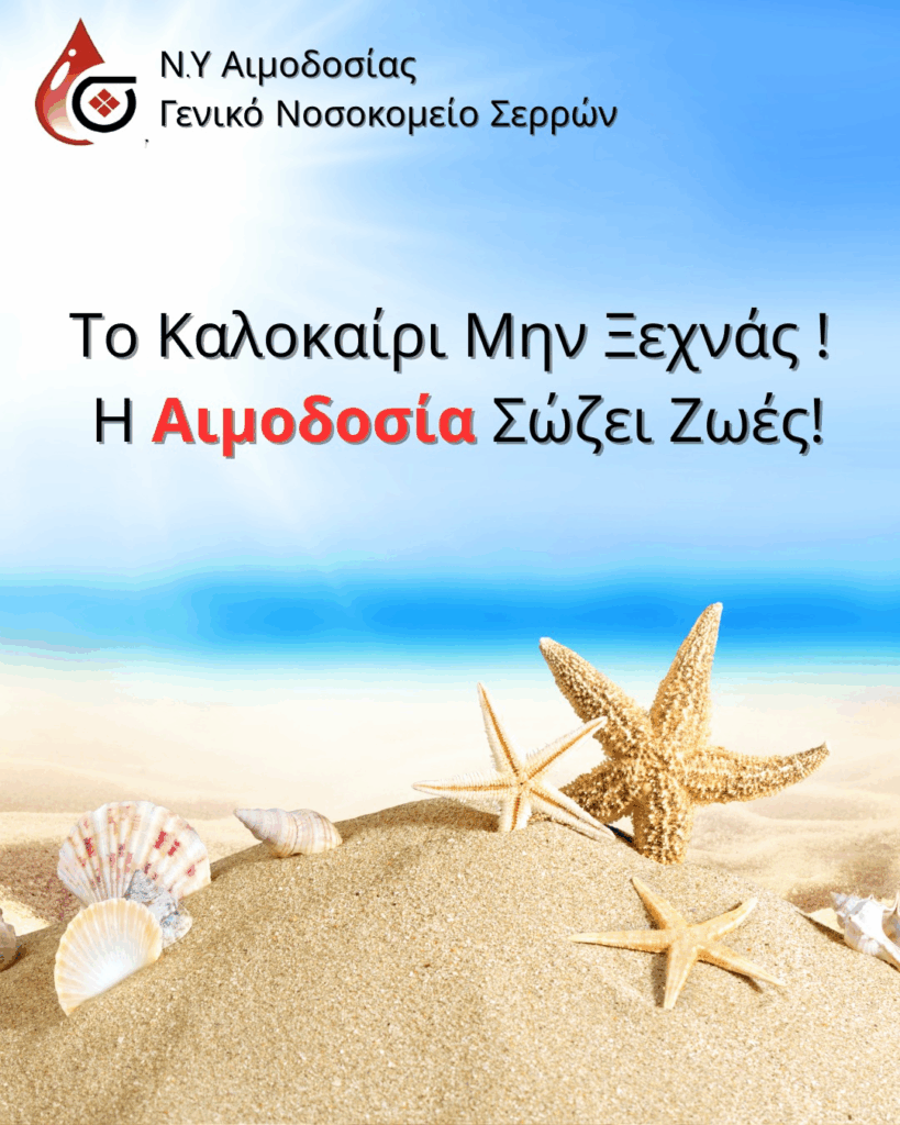 Το Τμήμα Αιμοδοσίας του Γενικού Νοσοκομείου Σερρών καλεί τους Σερραίους να προσφέρουν αίμα, πριν φύγουν για τι ς διακοπές τους, να αφιερώσουν δέκα λεπτά από τον χρόνο τους και να χαρίσουν ζωή σε συνανθρώπους μας .